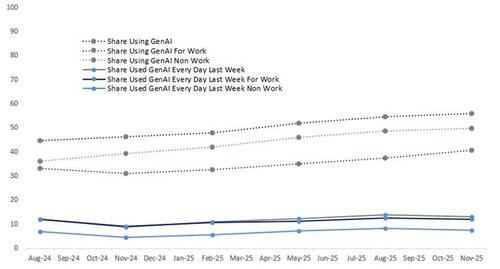 The St Louis Fed has data on AI adoption from the Real Time Population Survey. The first order presentation of AI adoption is generally a binary question: Do you use AI? The more important question insofar as it relates to the AI displacement narrative is: how intensely is AI being used for work? We can tease out the answer from a subset of the St Louis Fed data that buckets by frequency of AI use. We would posit that if AI represents imminent displacement risk, the real time population data would show an inflection upwards in the daily use of AI for work. The data seems unexpectedly stable and presents little evidence of any imminent displacement risk (solid lines at the bottom of the chart).