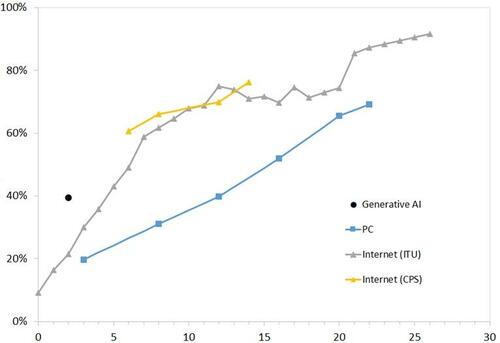 Share of working age adults using AI at work for three technologies: generative AI, PCs and the internet