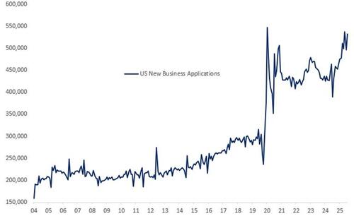 At its core, AI-driven automation is a productivity shock. Productivity shocks are positive supply shocks: they lower marginal costs, expand potential output, and increase real income. They are in isolation disinflationary and growth-enhancing in the medium term. Historically, every major technological advance: steam power, electrification, the internal combustion engine, computing, has followed this pattern. The counterargument suggests that AI differs because it displaces labor income directly, thereby suppressing aggregate demand. If firms produce more at lower cost, prices fall or margins expand (or both). Lower prices increase real purchasing power, which generally increases consumption. Higher margins increase retained earnings and investment capacity. If output rises and real GDP increases then by national income accounting identity something must be rising on the demand side: Consumption, investment, government spending, or net exports must be increasing (more here). A scenario in which productivity surges but aggregate demand collapses while measured output rises violates accounting identities. For AI to generate a sustained macro contraction one must assume that labor income falls and no compensating rise occurs in investment, fiscal transfers, or external demand. The surge in new business formation is an interesting point of reference here.