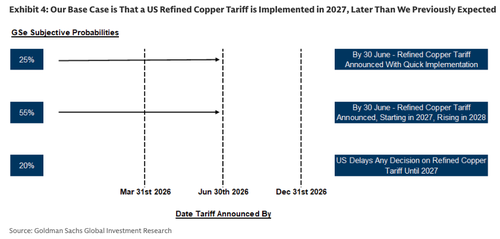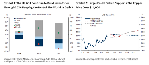 Now, a separate team of analysts from Goldman, led by Eoin Dinsmore, has upgraded their LME copper 2026 price forecast from $10,650 to $11,400, based on the "lower probability of a refined copper tariff being implemented by H1 2026 as affordability concerns take priority."