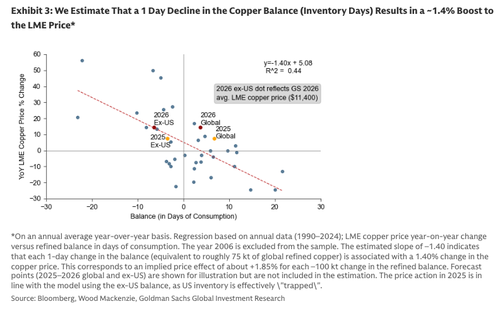 We think the ex-US copper balance is now the key driver of the LME price, while historically the price has been driven by the global market balance. Our rule of thumb is that a 1 day decline in the copper balance (in terms of inventory days of consumption) results in a ~1.4% boost to the LME price (on a YoY annual average basis) (Exhibit 3). Because US inventory is effectively "trapped", we apply our model to ex-US inventory changes in 2025 and 2026. In 2026, our base case is that ex-US copper inventory draws by ~450kt - which allows a 750kt build in the US (similar build to 2025), given our estimated 300kt global surplus. Our upwardly revised 2026 average LME price forecast of $11,400 is in line with the model-implied price change from this inventory change.