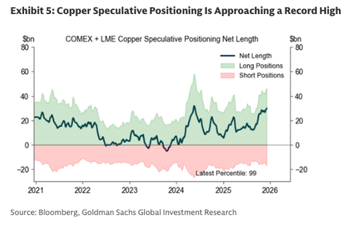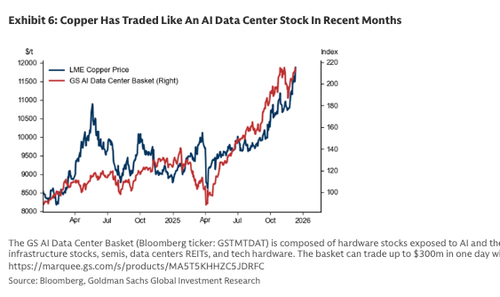 Copper futures on the London Metal Exchange hit a new record high late last week at $11,952 per ton, and are now trading near $11,700 per ton, up more than 33% year to date. The explosive move, which has copper trading like an AI data center stock in recent months, prompted Goldman analysts to warn earlier this month of a “circular melt-up.”