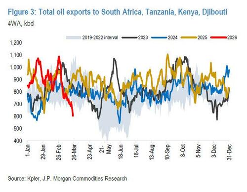 In some cases, the impact may be felt in Africa more quickly than in Europe due to shorter shipping times from the Gulf. East Africa is particularly vulnerable to disruptions in refined-product flows from the Middle East and Asia. Early signs of stress are emerging: Kenya is already experiencing fuel shortages at the retail level, while Tanzania still maintains adequate stocks. In South Africa, current pressures stem more from pre-buying and price expectations than from actual shortages, although jet fuel inventories remain limited. Oil exports to the four African countries most dependent on Hormuz fell 43% MoM and 45% YoY on a 4-week average.