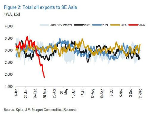 - While some cargoes passing through Hormuz may provide limited relief, the primary challenge has shifted from price to physical scarcity. Oil exports to Southeast Asia fell 41% MoM and YoY on a 4-week averaged