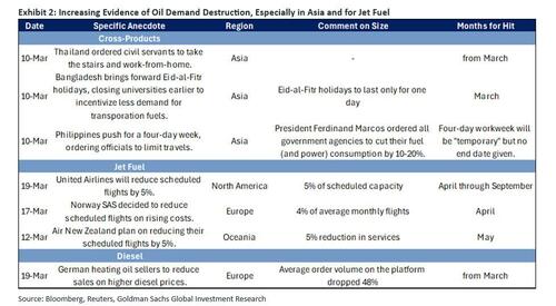 Governments across the region have implemented preventive and emergency measures to stretch fuel supplies and cushion price shocks (see Demand destruction has arrived). The following table from Goldman shows the various demand destruction events, most of which are affecting Asia.