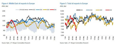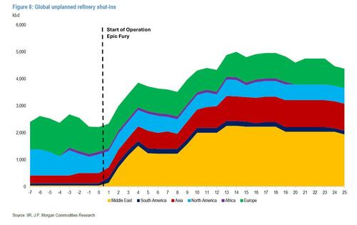 At the same time, the first operational response is already visible in refining activity. Although some limited capacity is coming back online in the Middle East, JPM is tracking 2.0 mbd of unplanned shut-ins in the region due to physical damage or precautionary closure . Citing crude shortages, Asian refineries have expanded unplanned cuts to 1.0 mbd including 300 kbd from pre-conflict levels, with 770 kbd in China, 130 kbd in Japan and 90 kbd in Malaysia. For now, we see little deviation in unplanned shut-ins in Europe and the Americas from pre-conflict levels.