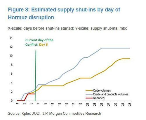Four weeks ago, just as the Iran war broke out and WTI was still trading well below $80, JPMorgan's commodity analyst Natasha Kaneva was the first to warn that the first big risk to oil prices were the accumulating shut-ins of oil production among Gulf Producers as the inability to move new product meant storage facilities would quickly fill, forcing production to be shut, a process which could take weeks if not months to undo. Well, with the war now in day 27, we are effectively there, with much of Gulf shut-ins now implemented and limiting maximum output for the foreseeable future even if the Strait were to reopen tomorrow.