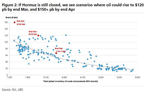 UBS sees oil rising to $150+ by the end of April if Hormuz remains closed.