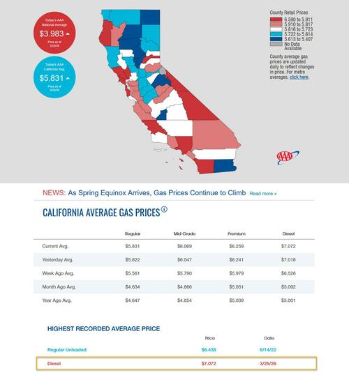 And as if to confirm his warning, just hours later the price of California Diesel hit a record high just above $7 per gallon, or $7.072 to be precise.