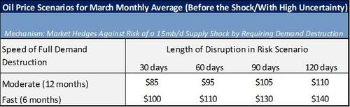 We estimate potential market prices in March if the market were to require demand destruction to hedge against inventories falling below critical levels in a risk scenario (which differs from the market's base case) with longer disruptions (e.g. 120 days).
