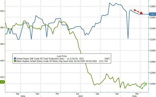 US Crude production remains 'near' record highs - but despite a rising rig count, production is not increasing...