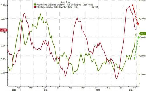 Total Cushing stocks are their highest since July 2024 while total gasoline stocks tumbled to their lowest since the start of the year...