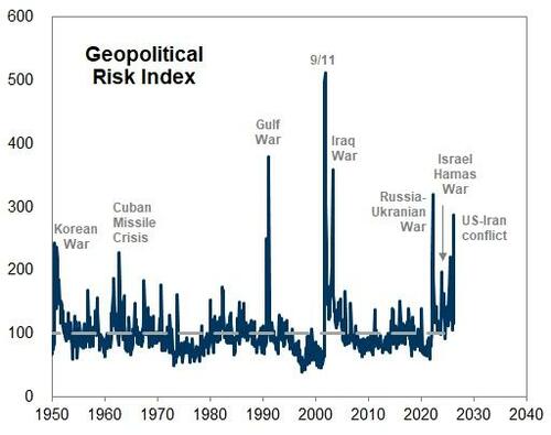 With market participants lunging from one headline to the next, it is perhaps worth noting that so far in 2026, there are just 44 trading days down, and 205 to go... and geopolitical risk is going vertical once again...