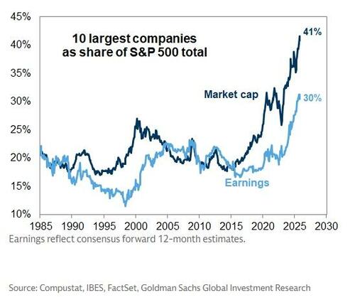 Concentration of S&P 500 market cap and earnings in the 10 largest index constituents...