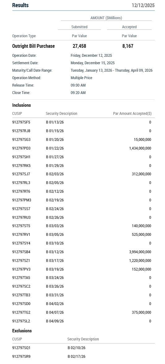 As we previewed yesterday, the Fed's open market asset purchases - also known as QE-Lite, NOT QE, or more technically, Reserve Management Purchases - have restarted (as we first said he would a month ago, when this idea was once again highly contrarian), and this morning at 9:20am the Fed concluded its first T-Bill monetization procedure, purchasing $8.167 billion from Primary Dealers and other authorized open market participants.