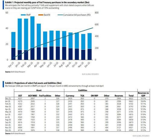 In a note from BofA's Mark Cabana, the strategist writes that the Fed RMP pace is expected to continue at $40b/m until the mid April tax date He notes that "after April the Fed likely expects slowing the pace of RMPs to $20b/m; we use this as our base case for now (Exhibit 1, Exhibit 2)." That said, Cabana disagrees that the Fed will sunset RMP and sees "RMP risks as skewed to a higher pace of purchases for longer."