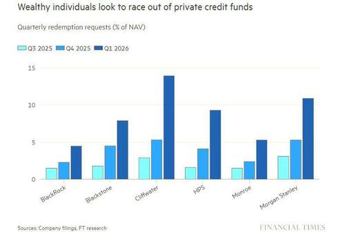 Just hours after we learned that Apollo was the latest Private Credit giant to gate investors in its flagship private credit fund, and warned it will also gate redemption requests in the future having been hit with over 11% of withdrawal demands while limiting quarterly redemptions to just 5%, this morning the FT reported that Ares Management has also limited withdrawals from one of its marquee private credit funds pitched to wealthy individuals, as redemptions surged to 11.6% in the first quarter amid a broad flight from the asset class.