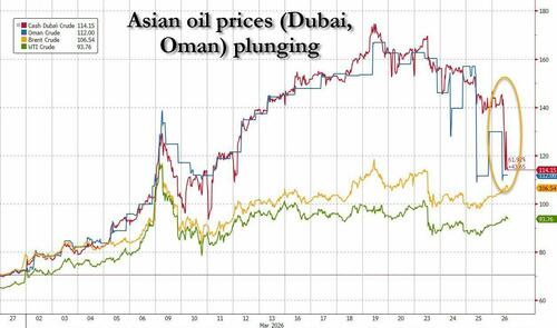 And yet things changed yesterday: as we first pointed out, Asian oil prices tumbled yesterday when more traders realized that Hormuz transits to Asia were gradually normalizing.
