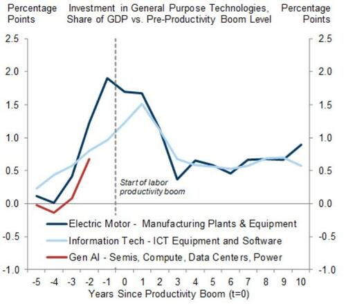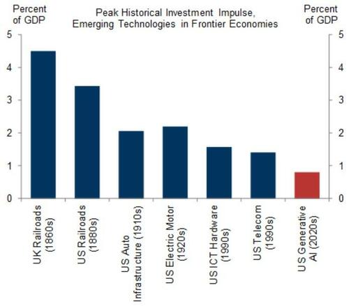 Joseph Briggs highlighted how the capital investment that has gone into the AI revolution so far pales in comparison to the investment (as a % of GDP) that we saw in prior productivity transformational investment cycles like the electric motor of the 1920s and the Technology boom of the 1990s.