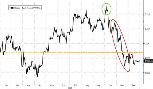 But while the barbarous relic was roaring, crypto was snoring. After hitting record highs intra, Bitcoin ended the year down around 6% (its worst annual loss since 2022)...