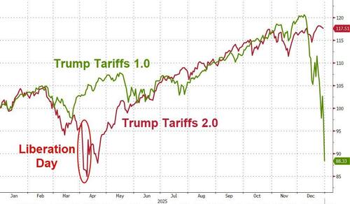 But, away from AI, in April, we were told the world would end - dogs and cats living with each other, and all the worst parts of the bible - when Trump unleashed his Liberation Day tariffs... but by the end of the year, initial jobless claims are near record lows, the economy is growing solidly, and the S&P 500 is up around 18%, massively outperforming Trump's first tariff term (which was admittedly hit at the end by the repo crisis collapse)...