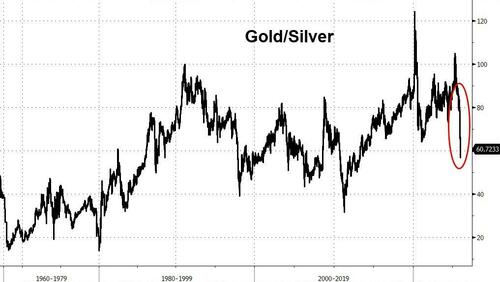 Gold has plunged relative to Silver (in March 2020, an ounce of gold bought 124 ounces of Silver; today it only buys 60 ounces)...