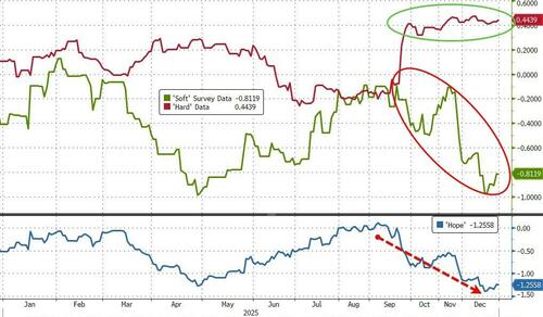 The 'macro' gains were dominated by 'hard' data improvements while 'soft' survey data plummeted, dragging down 'hope' to the lows of the year...