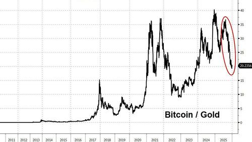 Bitcoin has plunged relative to gold (a year ago, one bitcoin bought 40 ounces of gold; today it only buys 20 ounces)...