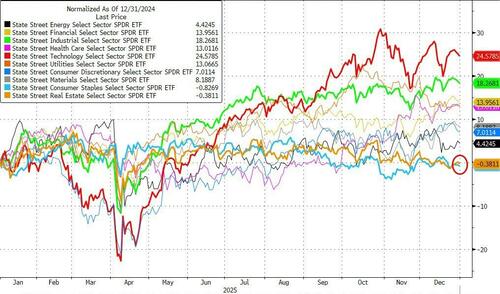 Tech & Materials outperformed in 2025 while Staples and real Estate ended the year in the red...