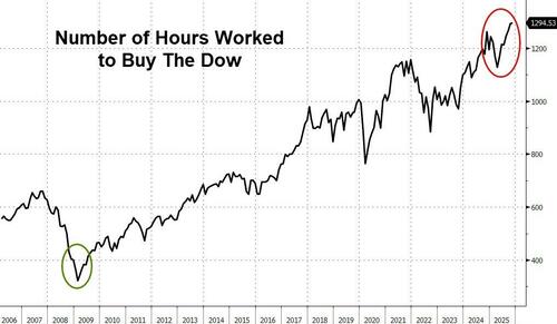 One way to visualize the decoupling between Wall Street and Main Street is the number of hours it takes to 'buy' The Dow... which has surged in the last 20 years from around 400 hours to almost 1300 hours...