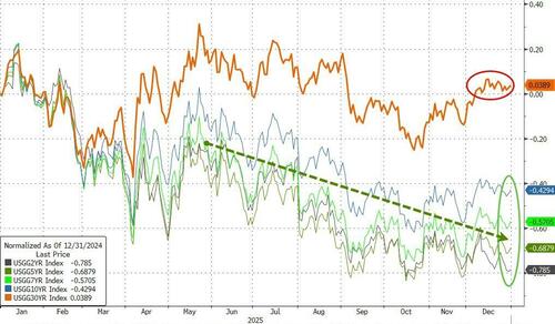 Bonds were mixed on the year with the long-end underperforming (+4bps on the year), while the short-end was aggressively bid (down almost 80bps)...