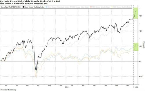 “Our base case of cyclical recovery and a sustained AI supercycle tilts our allocation toward cyclical sectors, balanced with selective defensives like health care,” say Barclays strategists led by Emmanuel Cau. “We have shifted toward a more balanced stance between last year’s winners and laggards, given extreme performance gap driven by AI exposure, tariffs and FX sensitivity. Amid geopolitical risks, strategic autonomy anchors our positioning, with overweights in tech, defense and mining, plus overweight banks to capture both structural and cyclical upside.”