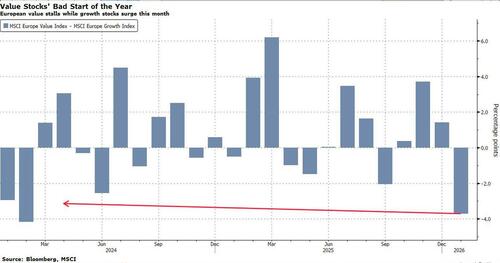 Value, last year’s big winner in Europe when it comes to investing styles, is struggling to follow up on its record annual outperformance over growth. The MSCI Europe Value gauge is barely higher this year, while its growth equivalent has already climbed nearly 4%. With expensive sectors like tech and industrials back in favor, the rotation out of value may have legs, especially with US interest rates expected to drop further this year.