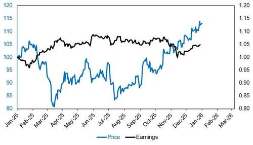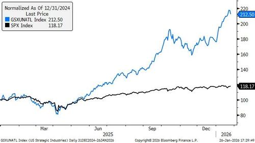In the new year, the new administration published a handful of documents defining national security strategy, pointing to a few industries that could be perceived to be important to US economic security. This includes a balanced trade, securing access to critical supply chains and materials, reindustrialization, reviving defense, and energy dominance. Our National Interest basket (GSXUNATL) represents those industries best, across rare earths & uranium (20%), oil & gas (20%), other metals & mining companies (20%), defense including drones and satellite technologies (20%), cyber-security (10%), and domestic chip-providers for manufacturing machinery / AI / data storage (10%). The basket can trade $300m in one day with no name exceeding 10% of volume.