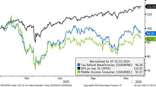 GSXURFND is a new basket that consists of US-listed companies in the consumer sector we expect to benefit from tax refunds as it excludes big-ticket items that households tend to prepare for in advance, and focuses on smaller-ticket items that tend to benefit from slightly higher discretionary spending. GS research expects revenue growth for middle income consumer stocks should accelerate in early 2026. Our economists forecast 2026 real income growth exceeding 2.5% for the third and fourth income quintiles as the tariff boost to inflation diminishes and the tax cuts passed in last summer’s fiscal package translate into refunds. Labor market stabilization should also support income and spending growth. We would use small cap weakness in the short term as an opportunity to enter into the tax refund trade.