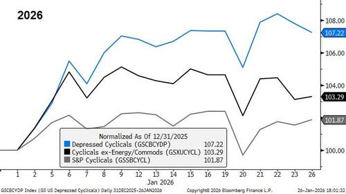 In 2025, we notice a handful of cyclical themes lagged the broader sectors by roughly ~10pp, relative to S&P cyclicals. These cyclical themes include industrials that tend to benefit from bonus depreciation, onshoring beneficiaries, analog semis, transportation companies, as well as non-tech and non-AI companies that we consider to have successfully integrated AI into their workflows.