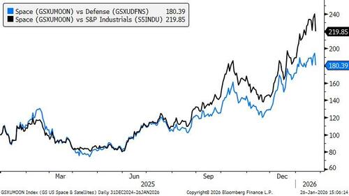 Our Space/Satellites basket (GSXUMOON) consists of companies involved in space exploration activity and the development of satellites, successfully isolating this group from the broader defense and industrials sector, outperforming both by ~2x in the last year.