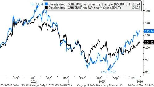 We like going long our global obesity drugs basket (GSHLCBMI) since it provides exposure to the leading companies (LLY and NVO) as well as potential emerging leaders in this space: market is moving beyond the dominance of a few key players, with new entrants and diverse therapeutic approaches intensifying competition. Large pharmaceutical companies are actively engaging in M&A and licensing deals to replenish pipelines and acquire next-generation obesity assets, as evidenced by Pfizer's acquisition of Metsera and Roche's deal with Zealand Pharma in late 2025.