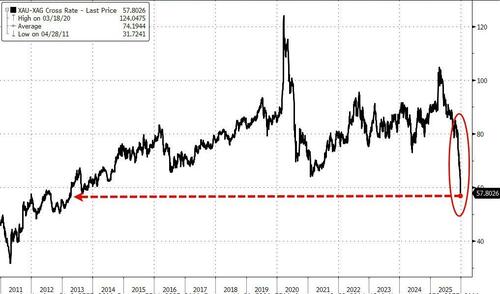 Gold grabbed the majority of the attention over the year, despite its little sister silver outperforming... sending the Gold/Silver ratio plunging down to 57x - the lowest since April 2013...