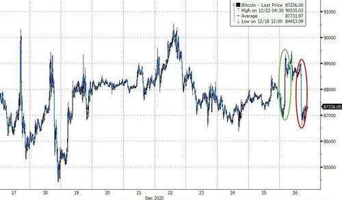 On the other side of the alternative currency wall, crypto had another tough week with bitcoin down for the 4th straight week. Today saw yet another pump and dump move in Bitcoin as it tested above $89,000 only to suddenly puked at 10amET (again) back below $87,000...