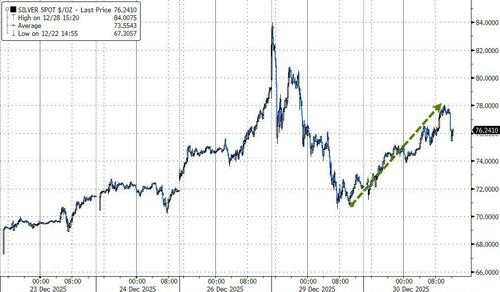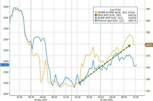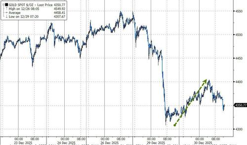 Precious metals rebounded from yesterday's panic-selling with Gold back above $4400 before fading this afternoon...