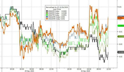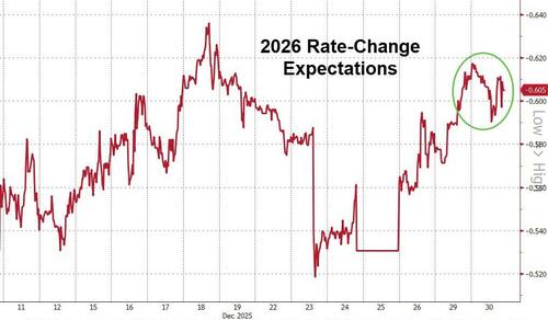 No reaction today to The Fed's Minutes with the market's expectations holding around 60bps for 2026 (well above The Fed's dot-plot expectations)...