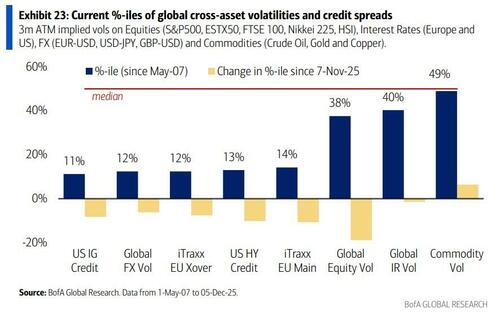 As BofA's cross-asset-hedging team notes, equity and credit had led the easing of cross-asset risk, with credit vol dropping below its 15th 17-year percentile and equity vol at its 38th percentile (down from the 58th percentile last month).