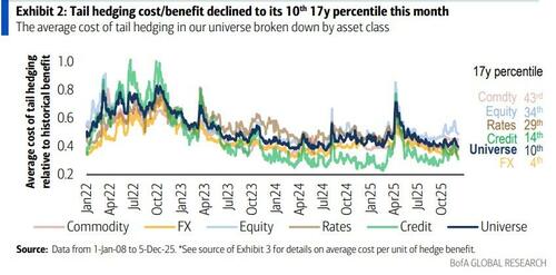 Overall, with the average cost of tail hedging at its 10th 17-year percentile, BofA believes it’s a timely opportunity to lock in cheap protection while staying invested into year-end.