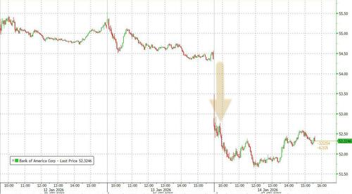 Another big story of the day is the continued rout in banks: yesterday it was JPM (which missed on underwriting fees and Jamie spooked investors with credit card cap commentary) and today it was Wells and Bank of America, which also missed on underwriting fees and also spooked investors with its credit card cap commentary, despite reporting generally very strong results.