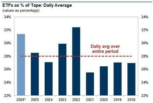 Bonus chart from Goldman's ETF desk: the bank points out that elevated ETF volumes (traditionally a short hedge to broader market selloffs) have been a common theme to start the year, including today with levels at 38% of the tape vs the 28% average. Looking on a year-by-year basis, the daily average of ETF as percentage of the tape has been elevated in 2026 YTD relative to previous years.