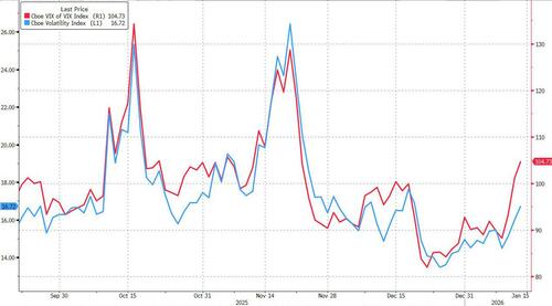 Finally, another potential red line: after the VVIX topped the 100 "Maginot Line" suggesting someone (well more than one) is buying upside vol protection, "setting the table” for acceleration flows to the downside into a Spot Eq selloff / modest Vol squeeze as per Charlie McElligott, today the VVIX rose another 4 points to a two month high of 104.73.