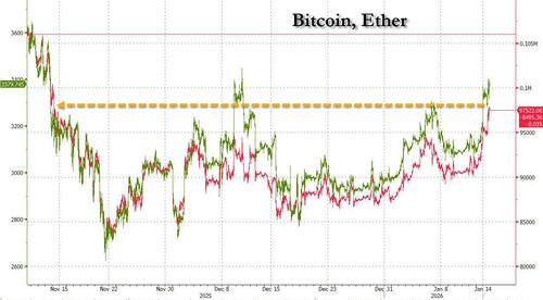 And while it had been left in the dust for much of the past two months, crypto continued its recent big move, with Bitcoin rising to a two months high of $97,500 and set to break above $100,000 on short notice.