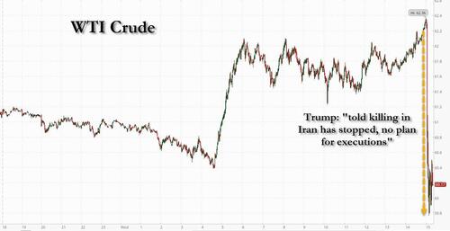 While yesterday attention was focused on Iran and European tensions amid the raging geopolitical chaos, today attention turned to Greenland, as negotiations between the US and Denmark/Greenland kicked off officially, while Iran loomed in the periphery, with everyone expecting Trump to launch an attack, when late in the afternoon Trump appeared to de-escalation tensions a bit when he said that he had been "assured that Iran would stop killing protesters." Markets immediately took that as a signal he could hold off on a threatened military response to the repression of widespread demonstrations in the nation, which in turn sent oil plunging red on the day after earlier hitting a 3 month high...