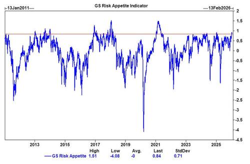 And while some are looking at the recent weakness as an "all clear" signal in the market, keep this in mind: Goldman's Risk Appetite Indicator is now at 0.9, a 96th percentile reading looking at historical data and the highest level since the start of 2025.